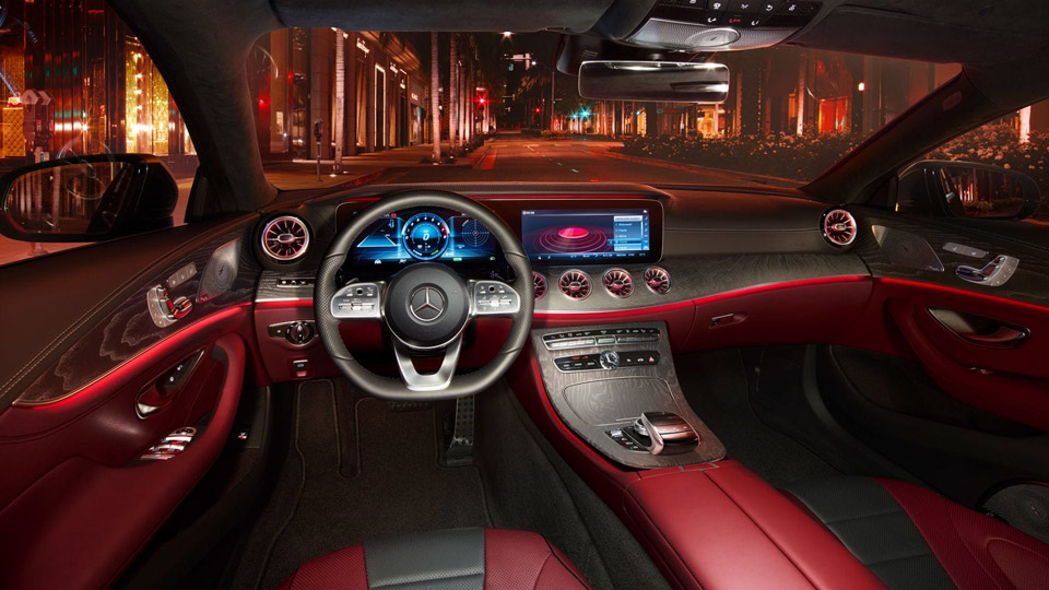 Detil menarik pada fascia depan terletak pada grille trapezoidal dengan aksen diamond yang sukses menyajikan kesan sensual khas coupé Mercedes-Benz, terlebih dengan sentuhan aksen louvre di garis tengah yang menemani logo Three Pointed Star. Apalagi dengan bumper sporty bergaya AMG Line dengan air intake samping berukuran masif dan grille bawah berbentuk honeycomb